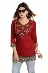 This stylish short kurti is coloured in dark blue shade and has pretty print design in a combination of yellow, orange and white on the front neckline, sleeves and at the bottom. The kurti is crafted with crepe fabric and has a V-shape neckline. The fabric keeps you irritation-free throughout the day. It ensures the utmost ease and comfort all day long. The length of the kurti is 30 inches. You can style it up with a pair of regular-fit denim jeans. Give it a gentle machine wash to foster its durability.